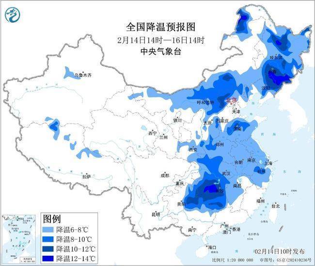 r预计,2月14日14时至16日14时,内蒙古中东部、东北地区大部、华北大部、黄淮、陕西南部、江汉、江淮、江南北部和西部等地气温下降6~10℃,局地降温12℃以上。